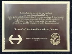 A Dra. Mariana Franco Ferraz Santino é médica formada pela UFF e especialista em dermatologia pela UFRJ, onde fez sua residência médica e também é preceptora. Atualmente é mestranda em Saúde Materno-Infantil no IPPMG/UFRJ, com foco em dermatologia pediátrica. Também tem experiência em tricologia, área que trata das doenças do cabelo e do couro cabeludo.